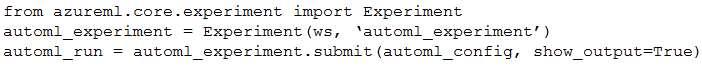 AutoMLConfigクラスを使用する実験を実行して、最大10回のモデルトレーニングの反復で自動機械学習タスクを定義します。タスクは、精度という名前のメトリックに基づいて、最もパフォーマンスの高いモデルを見つけようとします。