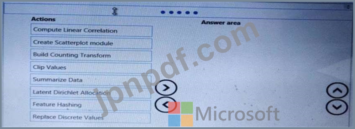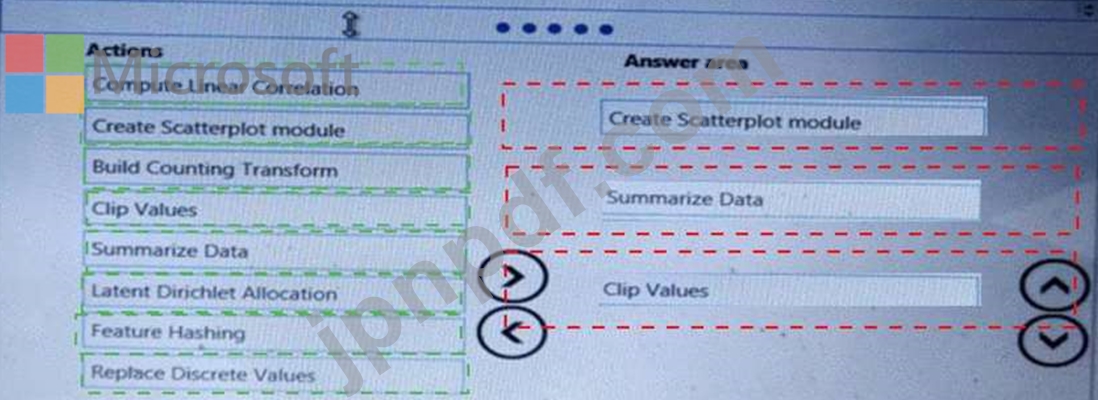 どの3つのAzureMachineLearning Studioモジュールを順番に使用する必要がありますか?回答するには、適切なモジュールをモジュールのリストから回答領域に移動し、正しい順序で配置します。