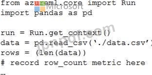 実験の実行が完了した後、Runオブジェクトのget_metricsメソッドを使用して返すことができるrow_countという名前のメトリックとして行数を記録する必要があります。
