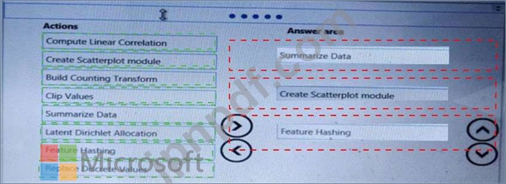 どの3つのAzureMachineLearning Studioモジュールを順番に使用する必要がありますか?回答するには、適切なモジュールをモジュールのリストから回答領域に移動し、正しい順序で配置します。