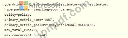 Hyperdriveを使用して、モデルのAUCメトリックを最適化するパラメーターを検索します。次のコードを実行して、実験用にHyperDriveConfigを構成します。