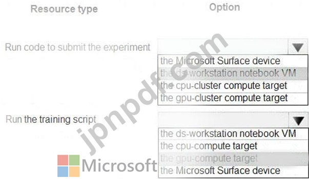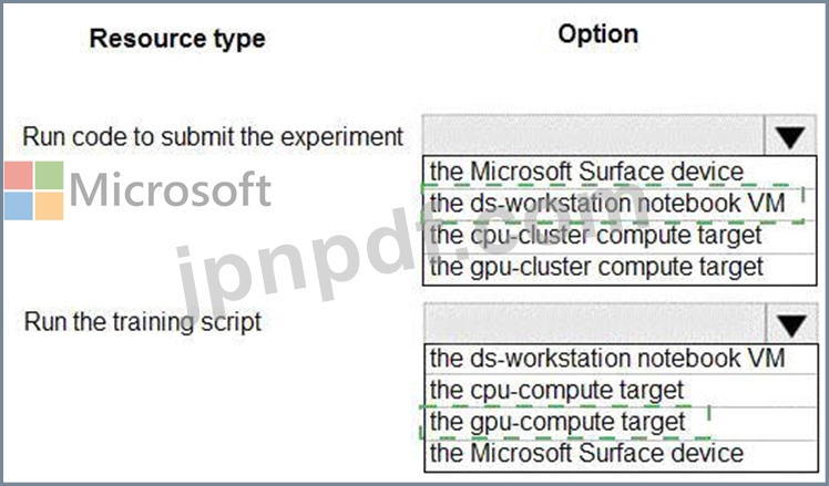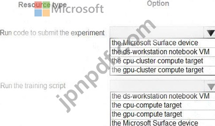 *4つのCPUおよびGPUベースのノードで名前が付けられたAzureMachineLearningコンピューティングターゲット実験を送信するためのコードの実行、およびモデルのトレーニング時間を最小限に抑えるためのスクリプトの実行に使用するコンピューティングリソースを指定する必要があります。
