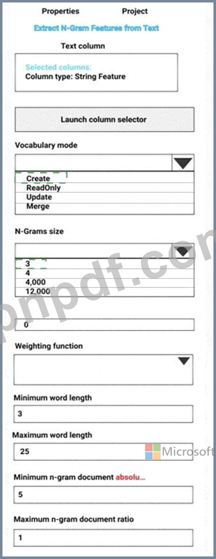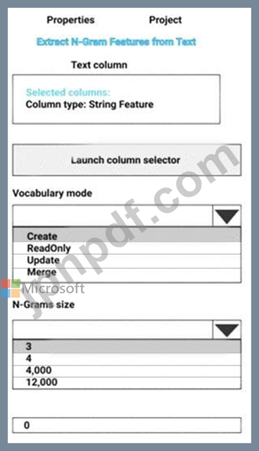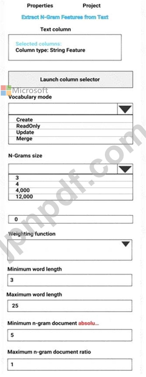 短い文の形式で書かれた12,000件の顧客レビューを含むCSVファイルを使用して感情分析を実行しています。CSVファイルをAzureMachineLearning Studioに追加し、実験の開始点データセットとして構成します。[テキストからN-Gram機能を抽出]モジュールを実験に追加して、データセットのカスタマーレビュー列からキーフレーズを抽出します。