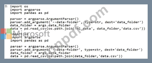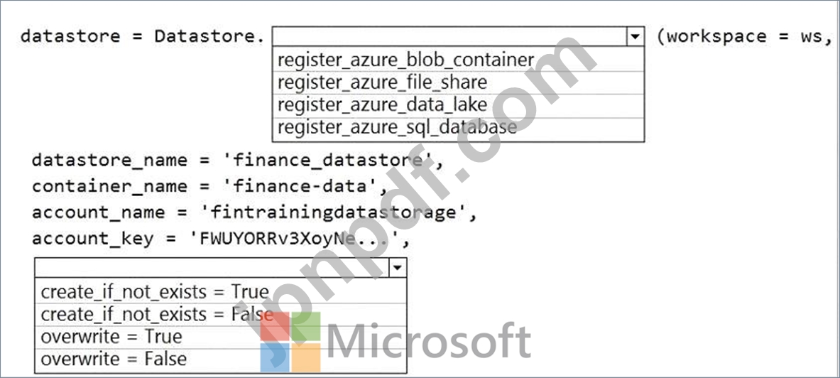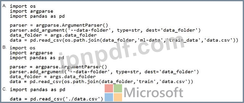 財務チームは、finance-dataという名前のAzureStorageBLOBコンテナー内のデータを使用してモデルをトレーニングするように依頼します。