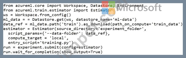 AzureStorageBLOBコンテナーのml-dataという名前のデータストアを定義します。コンテナには、data.csvという名前のファイルを含むtrainという名前のフォルダがあります。このファイルを使用して、Azure MachineLearningSDKを使用してモデルをトレーニングする予定です。