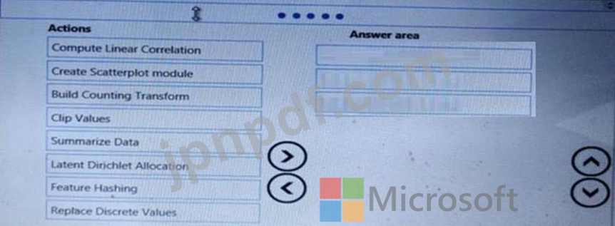 どの3つのAzureMachineLearning Studioモジュールを順番に使用する必要がありますか?回答するには、適切なモジュールをモジュールのリストから回答領域に移動し、正しい順序で配置します。