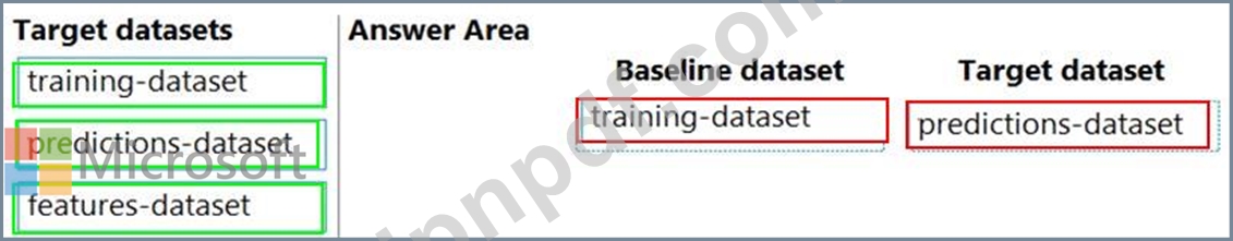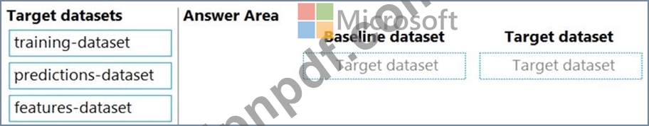 データドリフトモニターを構成するには、どのデータセットを使用する必要がありますか?答えるには、適切なデータセットを正しいデータドリフトモニターオプションにドラッグします。各ソースは、1回使用することも、複数回使用することも、まったく使用しないこともできます。コンテンツを表示するには、ペイン間で分割バーをドラッグするか、スクロールする必要がある場合があります。