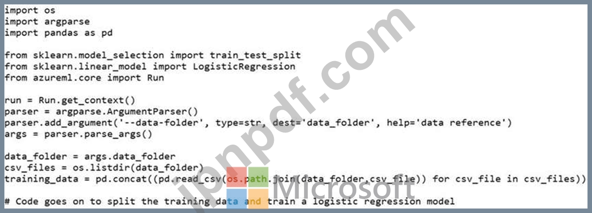 Azure ストレージ アカウント内の BLOB コンテナーを参照する training_data という名前のデータストアを作成します。BLOB コンテナーには、複数のコンマ区切り値 (CSV) ファイルが保存されている csv_files という名前のフォルダーが含まれています。