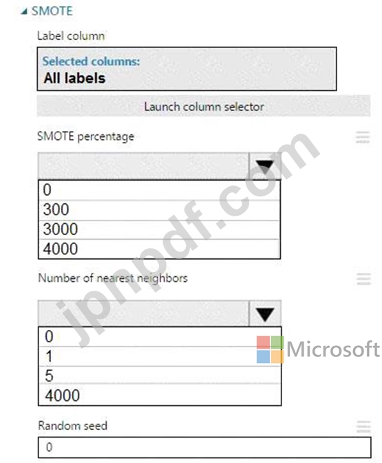 トレーニングセットは2つのクラス間で不均衡です。データ行を使用して、クラス1のトレーニング例の数を4,000に増やす必要があります。実験にSynthetic Minority Oversampling Techn ique (SMOTE)モジュールを追加します。