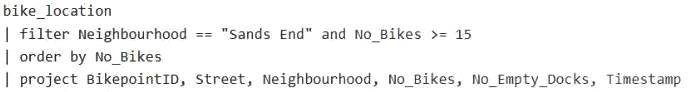 データを利用できるようにするには、変換とフィルターロジックを適用する必要があります。ソリューションは、No_Bikes が 15 以上の場合に、Sands End という地区のデータを返す必要があります。結果は No_Bikes の昇順で並べる必要があります。