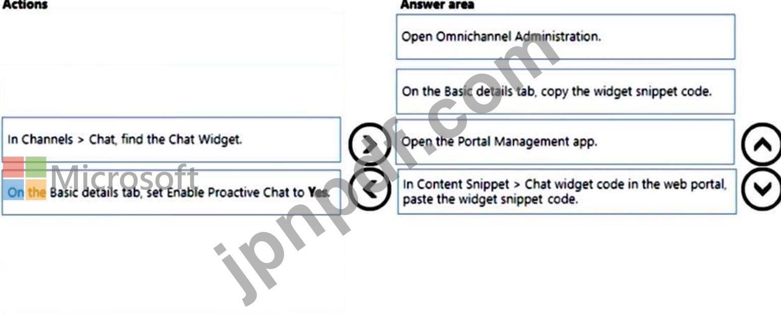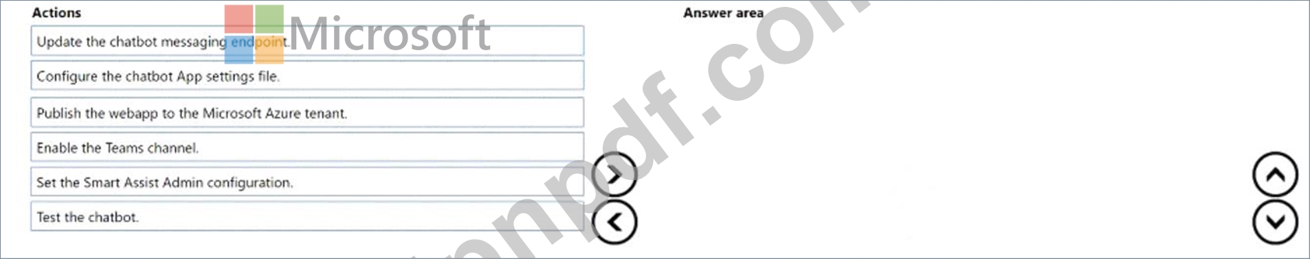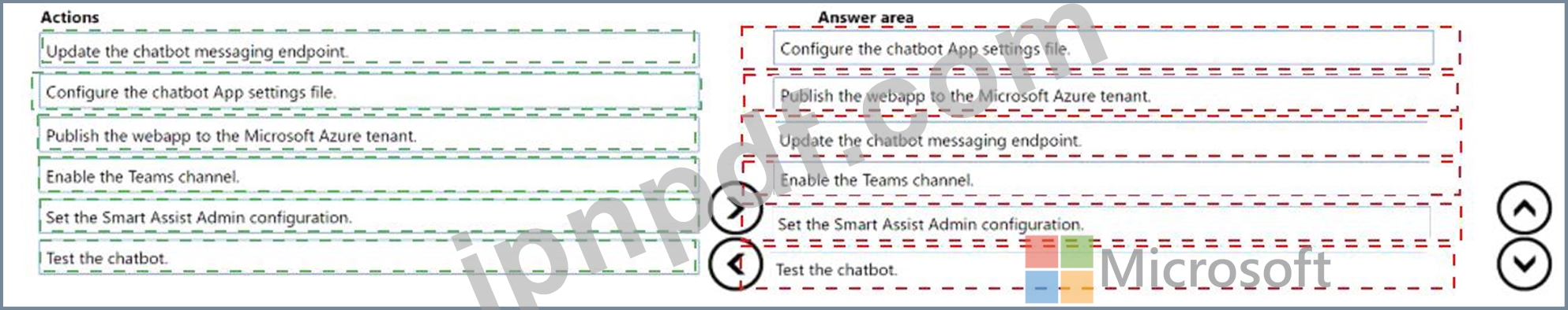 あるプロジェクトでは、特定の顧客ニーズに対応する際に推奨事項を提供するための自動化ツールの作成が必要です。このツールはインタラクティブで、エージェントが顧客ベースに最適なサービスを提供できるものでなければなりません。すべてのコミュニケーションはTeamsチャットを通じて行われます。スマートアシストチャットボットを設定する必要があります。アクションはどの順序で実行する必要がありますか?回答するには、すべてのアクションをアクションリストから回答エリアに移動し、正しい順序に並べ替えてください。