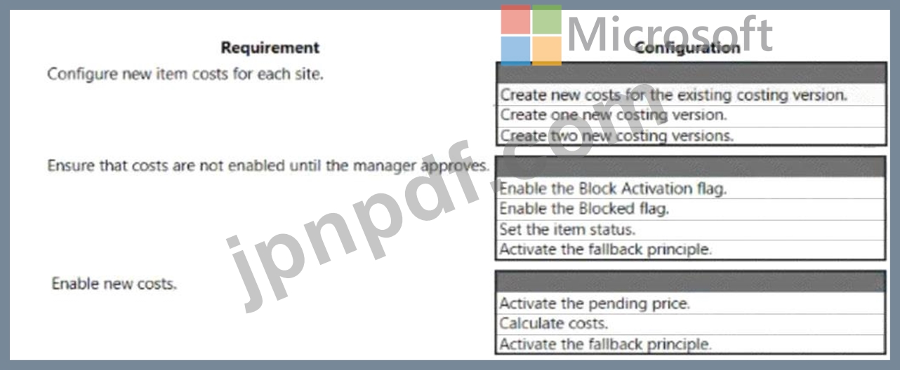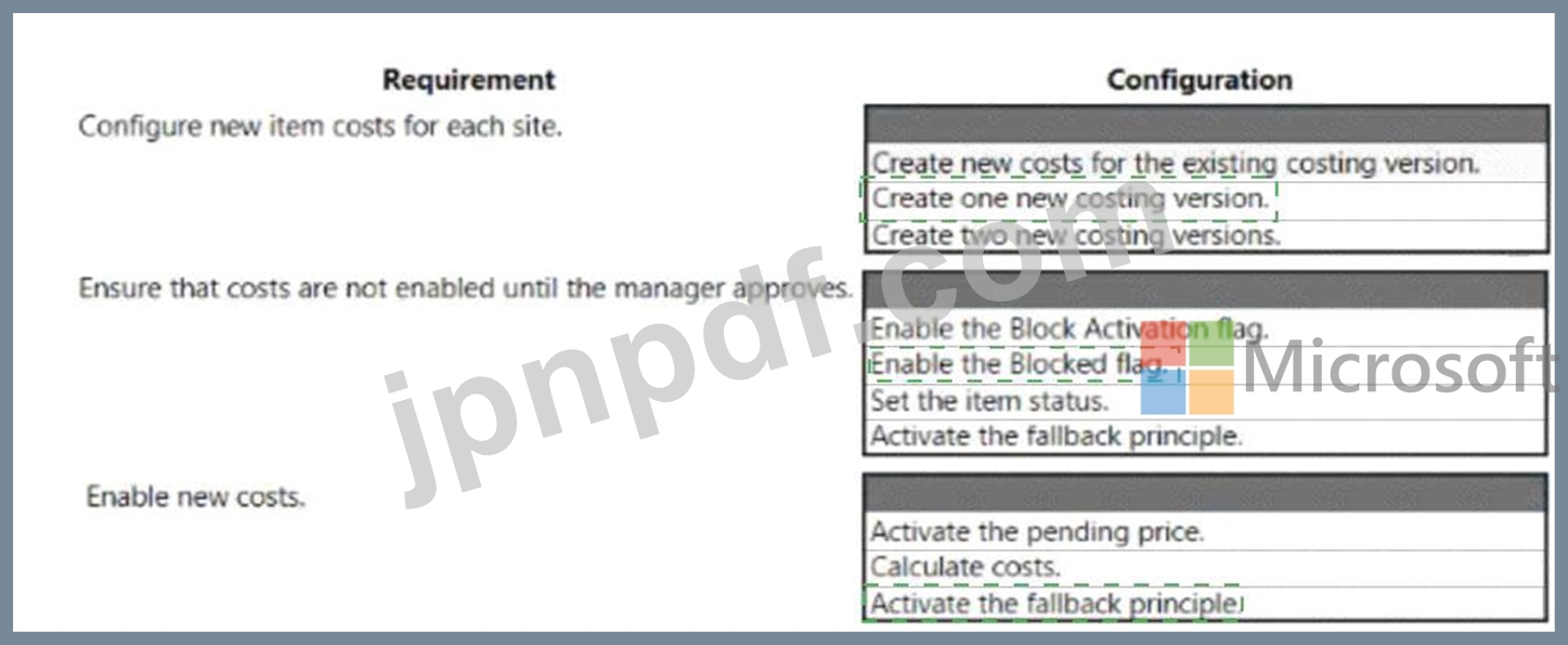会社は品目原価を更新したいが、必要な財務分析コードを除外したい。この変更は、更新前にユーザーに警告を表示する必要がある。原価計算方法は、品目を製造するために予想される計算済み原価に基づいて計算する必要がある。