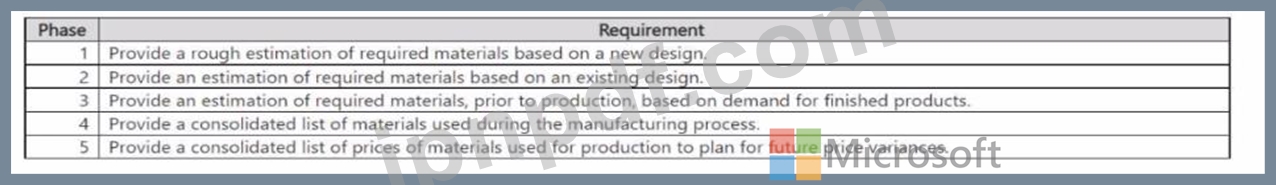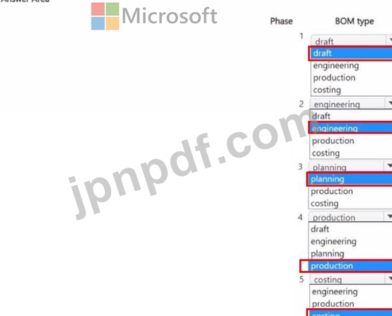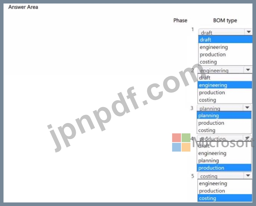 どの BOM タイプを使用する必要がありますか? 回答するには、回答領域で適切な構成オプションを選択してください。注: 正しい選択ごとに 1 ポイントが加算されます。