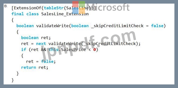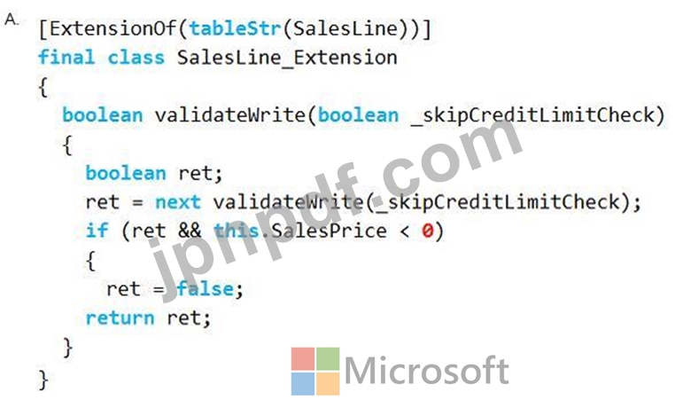 チェーンオブコマンドを使用して、SalesLineテーブルのvalidateメソッドを拡張する必要があります。新しい行を追加するときは、SalesPriceという名前の変数の値がゼロ以上である必要があります。
