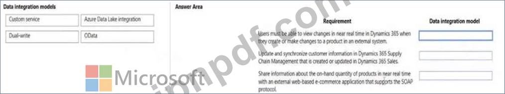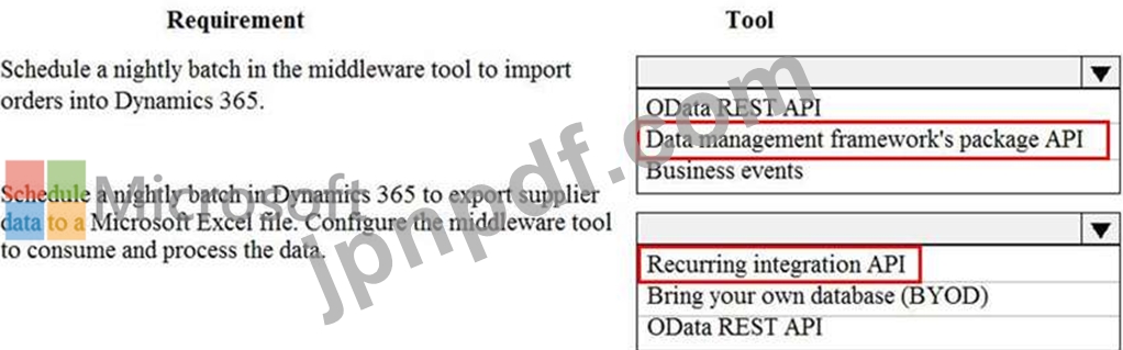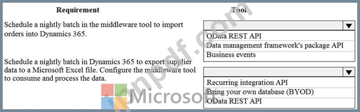 ある会社はクラウドベースの Dynamics 365 Finance 環境を持ち、小売業務に電子商取引 Web サイトを使用しています。この Web サイトには企業間 (B2B) 機能があります。同社はデータを処理するためにミドルウェア統合ツールを使用しています。