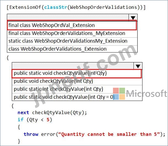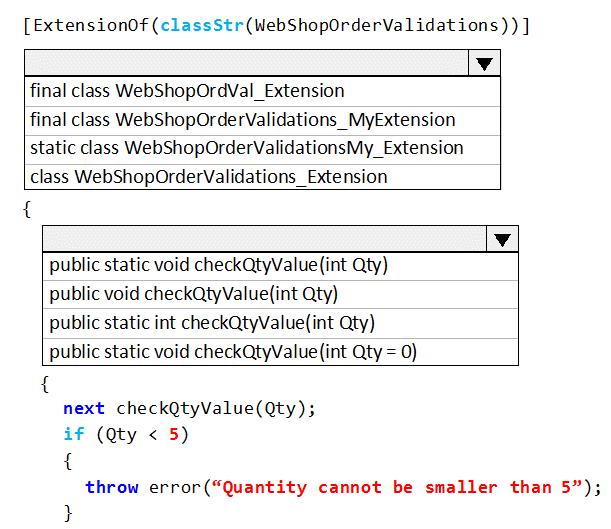 拡張クラスを作成し、Chain of Command (CoC) を使用してメソッドをラップする必要があります。Qty 変数の値が 5 未満の場合、コードは例外を発生させる必要があります。