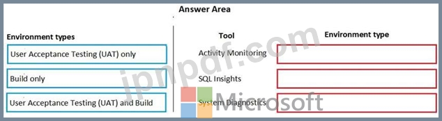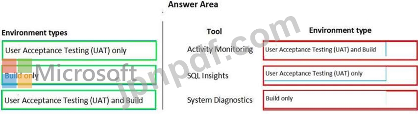各環境ではどの Lifecycle Services (LCS) ツールを使用する必要がありますか? 答えるには、適切な環境タイプを適切なツールにドラッグします。各環境タイプは、1 回使用することも、複数回使用することも、まったく使用しないこともできます。コンテンツを表示するには、ペイン間の分割バーをドラッグしてスクロールする必要がある場合があります。