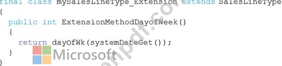 SalesLineType クラスを拡張し、システムの現在の日付の曜日を整数値として返す新しいメソッドを追加する必要があります。