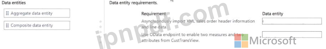 * PowerB1 レポートの CustTransView ビューから 2 つのメジャーと 2 つの属性を有効にするには、OData エンドポイントを使用する必要があります。実装するデータ エンティティの種類を識別する必要があります。
