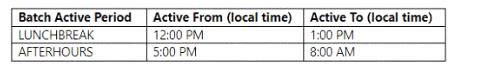 解決策: アクティブ期間が AFTERHOURS で、バッチ ジョブの繰り返しが Daily であるバッチ ジョブを作成します。