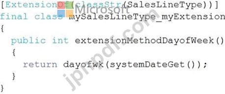 SalesLineType クラスを拡張し、システムの現在の日付の曜日を整数値として返す新しいメソッドを追加する必要があります。