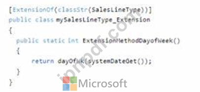 クラス SaleslineType を拡張し、システムの現在の日付の曜日を整数値として返す新しいメソッドを追加する必要があります。SalesLineType を拡張し、新しいメソッドを追加するクラスを作成する必要があります。