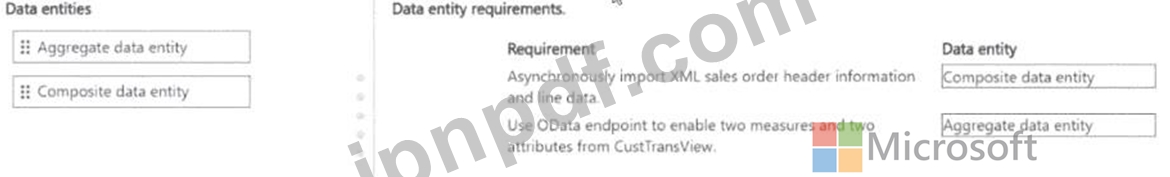 * PowerB1 レポートの CustTransView ビューから 2 つのメジャーと 2 つの属性を有効にするには、OData エンドポイントを使用する必要があります。実装するデータ エンティティの種類を識別する必要があります。