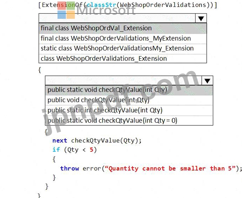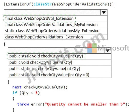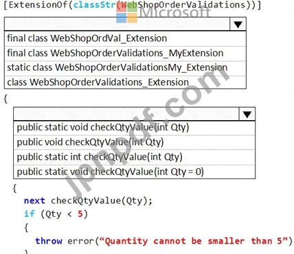 拡張クラスを作成し、Chain of Command (CoC) を使用してメソッドをラップする必要があります。Qty 変数の値が 5 未満の場合、コードは例外を発生させる必要があります。