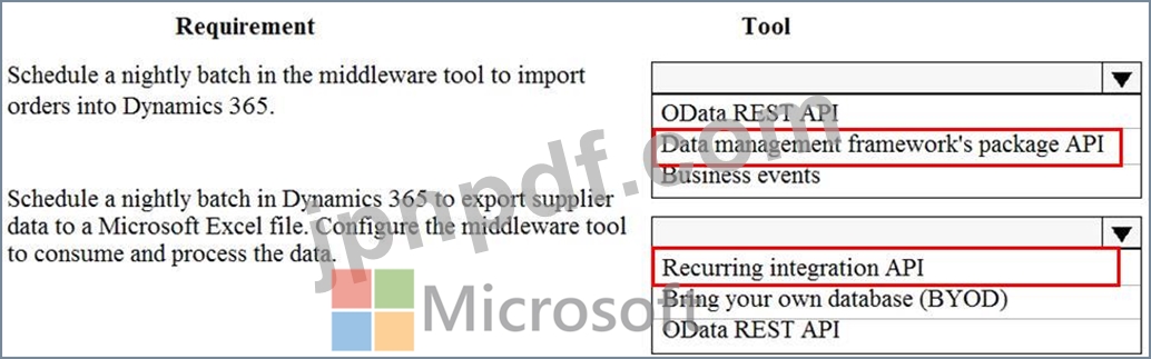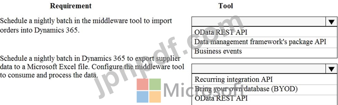 ある企業は、クラウドベースのDynamics 365 Finance環境を保有し、小売業務にeコマースウェブサイトを使用しています。このウェブサイトには、企業間取引(B2B)機能が備わっています。同社は、ミドルウェア統合ツールを使用してデータを処理しています。