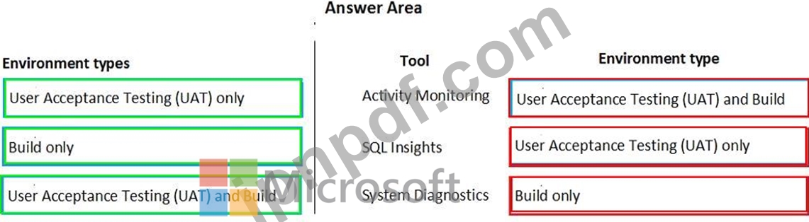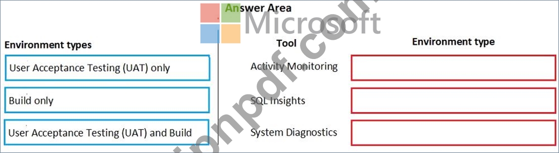 各環境でどのLifecycle Services (LCS)ツールを使用すべきでしょうか?適切な環境タイプを適切なツールにドラッグしてください。各環境タイプは、1回使用することも、複数回使用することも、まったく使用しないこともできます。コンテンツを表示するには、ペイン間の分割バーをドラッグしてスクロールする必要がある場合があります。
