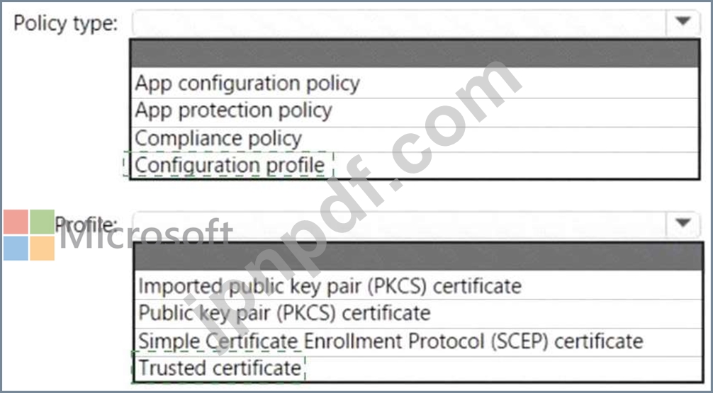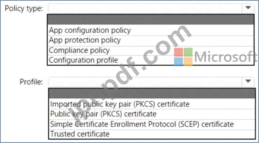 どの種類の Intune ポリシーとプロファイルを使用する必要がありますか? 回答するには、回答領域で適切なオプションを選択してください。