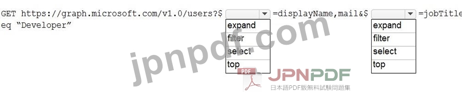 How should you complete the Microsoft Graph API query? To answer, select the appropriate options in the answer area.