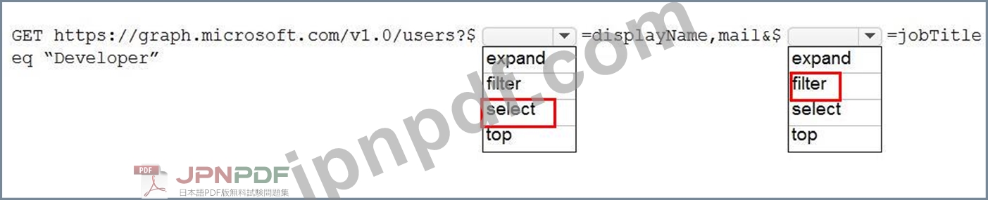You need to identify all users who have a job title of Developer. The solution must return only the display name and email address attributes of the users.