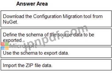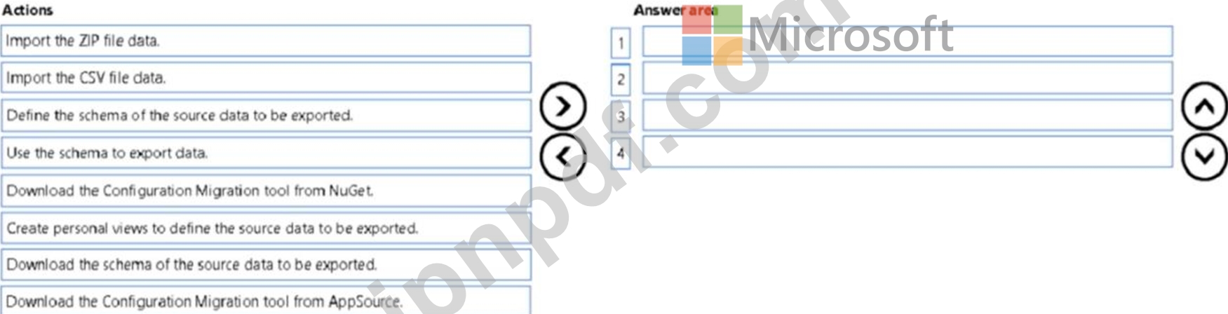 構成データとテスト データを 1 つの環境から別の環境に転送するプロセスを設計する必要があります。どの 4 つのアクションを順番に実行することをお勧めしますか? 回答するには、アクション リストから適切なアクションを回答領域に移動し、正しい順序で並べます。