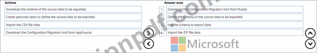 構成データとテスト データを 1 つの環境から別の環境に転送するプロセスを設計する必要があります。どの 4 つのアクションを順番に実行することをお勧めしますか? 回答するには、アクション リストから適切なアクションを回答領域に移動し、正しい順序で並べます。
