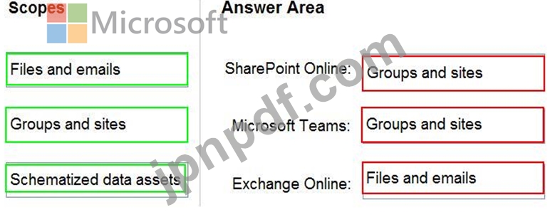 機密ラベルポリシーにはどのスコープを推奨しますか? 適切なスコープを適切な場所にドラッグしてください。各スコープは、1回、複数回、またはまったく使用されない場合があります。コンテンツを表示するには、ペイン間の分割バーをドラッグするか、スクロールする必要がある場合があります。