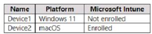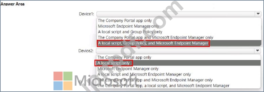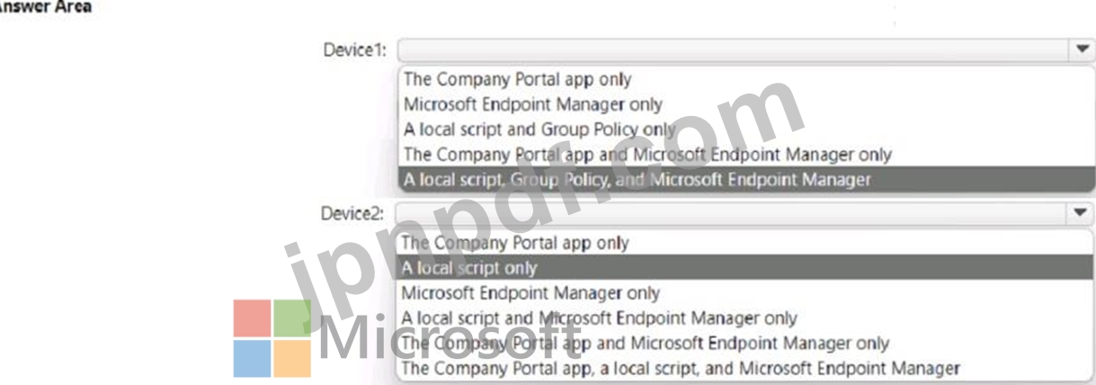 デバイスをMicrosoft Purviewにオンボードする必要があります。ソリューションでは、エンドポイントデータ損失防止(エンドポイントDLP)ポリシーをデバイスに適用できる必要があります。各デバイスのオンボードにはどのようなツールを使用できますか?回答するには、回答エリアから適切なオプションを選択してください。