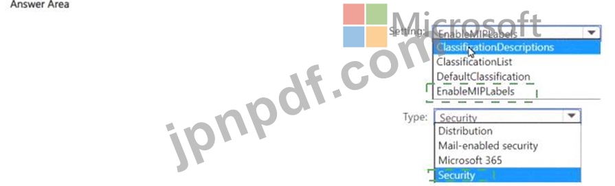 Microsoft 365 E5 テナントがあり、Sensitivity1 という公開済みの機密ラベルが含まれています。Group1 という Microsoft Entra グループを作成し、Group1 に Sensitivity! を割り当てる予定です。グループをどのように構成すればよいでしょうか?回答するには、回答エリアで適切なオプションを選択してください。