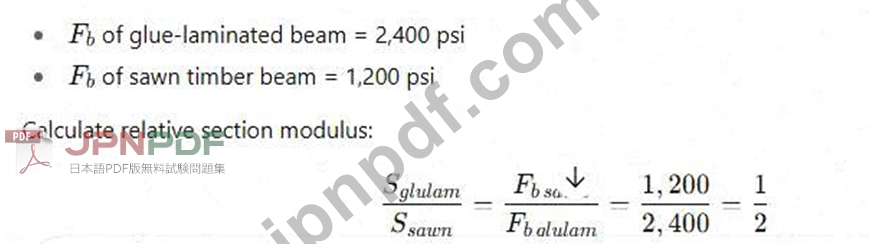 同じ瞬間に、接着積層梁では、製材梁に比べてどのくらいの比率の断面係数が必要ですか?(接着積層梁の F# が 2,400 psi、製材梁の F# が 1,200 psi であると仮定します。)