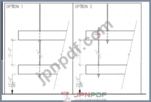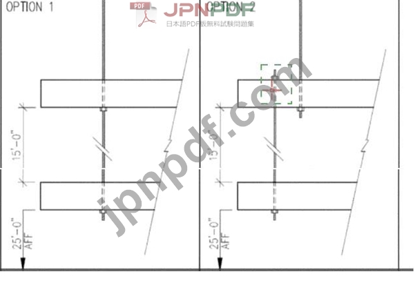 オプション1は、高層アトリウム空間に設置する鋼管梁とねじ棒からなるバナー吊り下げシステムの、当初設計された接合詳細です。構造部へのねじ棒接合部は、構造の一部として製作されます。残りの部材は現場で製作されます。梁とバナーの重量は各階で同一です。オプション2は、施工性の問題を軽減するために提案されました。この変更が承認される前に、構造上の影響を評価する必要があります。
