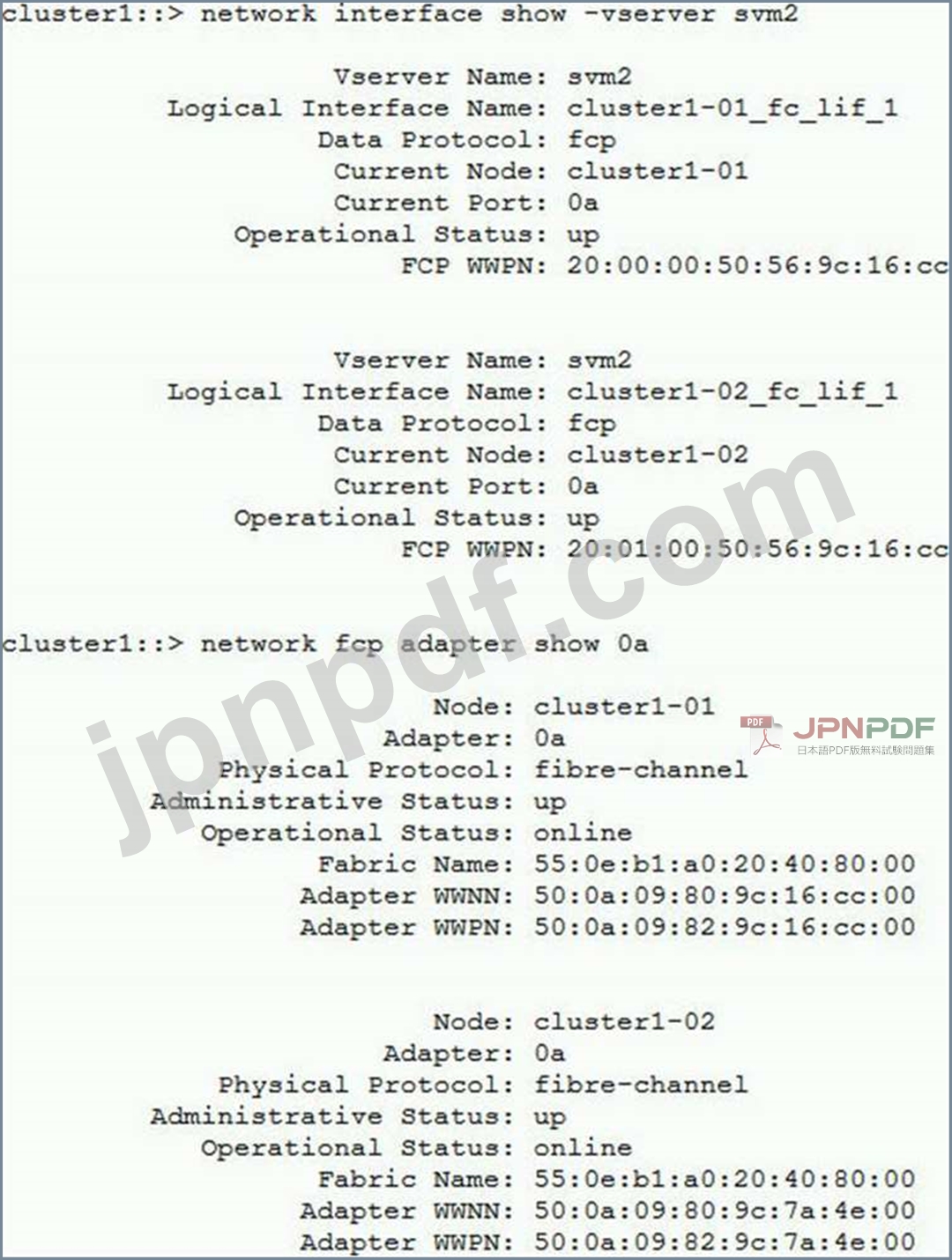 展示を参照すると、LUNへの接続を提供するためにFCスイッチでゾーン化する必要がある2つのファイバーチャネル名はどれですか。(2つ選択してください。)