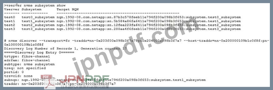 テスト中に、管理者はNVMeDiscoverコマンドを使用して間違ったサブシステムが返されたことに気付きました。管理者は、サブシステムとしてtest0_subsystemを期待していました。展示を参照すると、不一致の原因は何でしょうか。