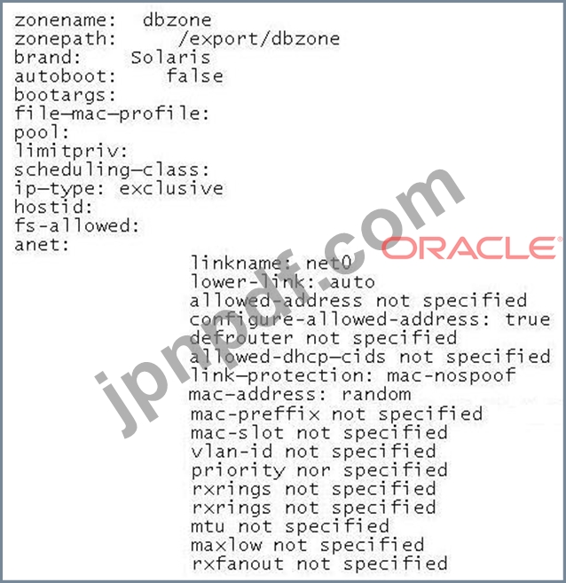 Solaris 11 サーバー上で dbzone という名前のゾーンの構成が完了しました。構成は次のとおりです。