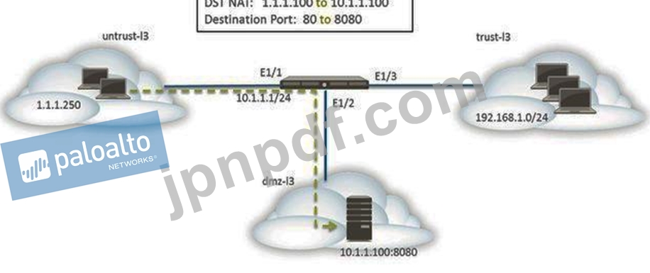 Web サーバーは、ポート 8080 で HTTP トラフィックをリッスンするように設定されています。クライアントは、TCP ポート 80 で IP アドレス 1.1.1.100 を使用して Web サーバーにアクセスします。宛先 NAT ルールは、IP アドレスとレポートの両方を TCP ポート 8080 の 10.1.1.100 に変換するように設定されています。