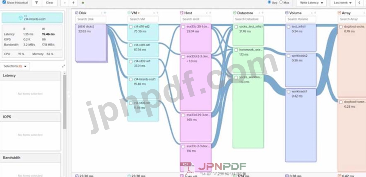 ESXi ホスト上で書き込み遅延が最も低い VM はどれですか?