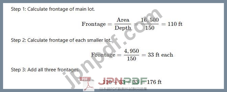 長方形の区画は16,500平方フィートで、奥行きは150フィートです。隣接する2つの長方形の区画はそれぞれ4,950平方フィートで、奥行きは150フィートです。3つの区画の道路に面した正面幅の合計は、直線フィートで何フィートですか?