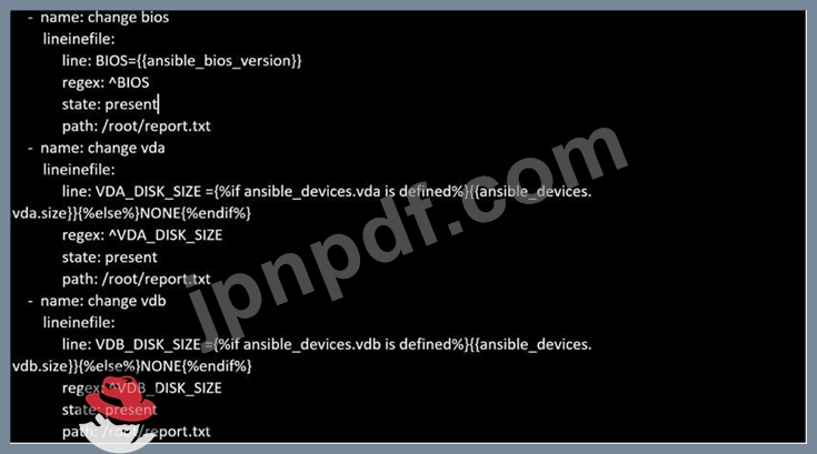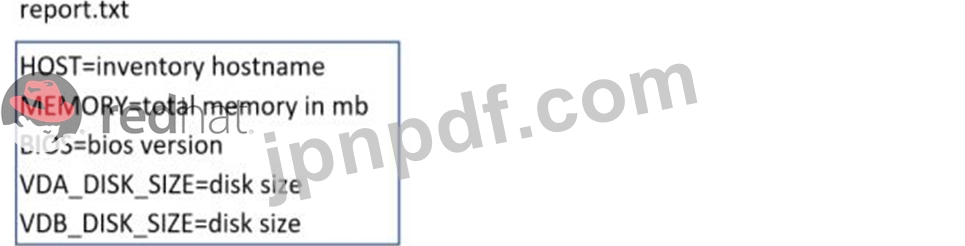 / home / sandy /ansible/にreport.ymlというファイルを作成します。このプレイブックを使用して、report.txtというファイルを取得します(以下のように表示します)。このファイルを/root/report.txtにあるすべてのリモートホストにコピーします。次に、ファイルの行を編集して、ホストの実際の情報を提供します。ディスクが存在しない場合は、NONEと書き込みます。