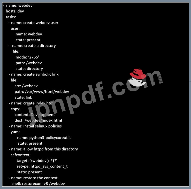 'home / sandy/ansibleにwebdev.ymlというプレイブックを作成します。プレイブックは、開発ホスト上にディレクトリAvcbdevを作成します。ディレクトリの権限は2755で、所有者はwebdevです。/Webdevから/var/ www / html/webdevへのシンボリックリンクを作成します。テストするテキスト「Development」Curlhttp://node1.example.com/webdev/index.htmlを表示するAvebdev7index.htmlからファイルを提供します