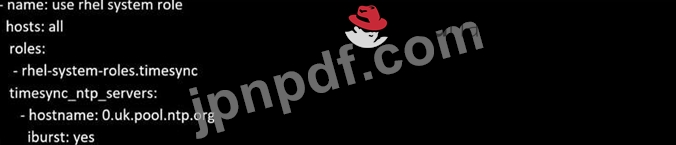 rhel システムロール timesync を使用して、timesvnc.yml という Playbook を /home/sandy/ansible に作成します。サーバー 0.uk.pool.ntp.org で現在構成されている nip を使用する時間を設定します。バーストを有効にします。これをすべてのホストで実行します。