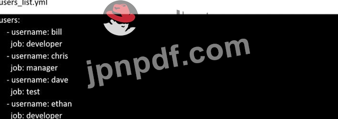 提供された usersjist.yml ファイルにユーザーを作成します。これは、/home/sandy/ansible にある users.yml という Playbook で実行します。これらのユーザーのパスワードは、TASK7 の lock.yml ファイルを使用して設定する必要があります。Playbook を実行するときは、TASK 7 の Secret.txt ファイルを使用して lock.yml ファイルのロックを解除する必要があります。